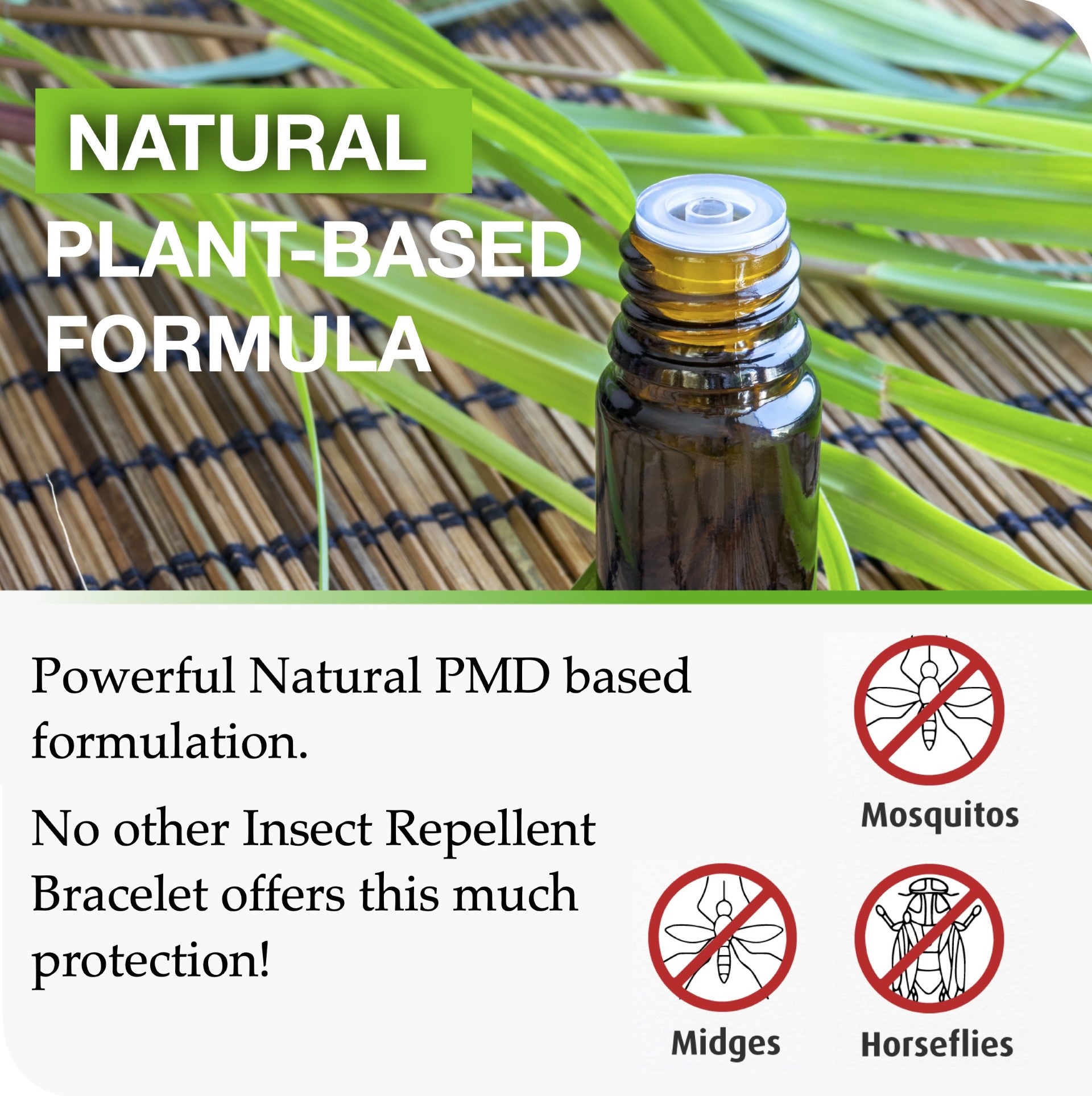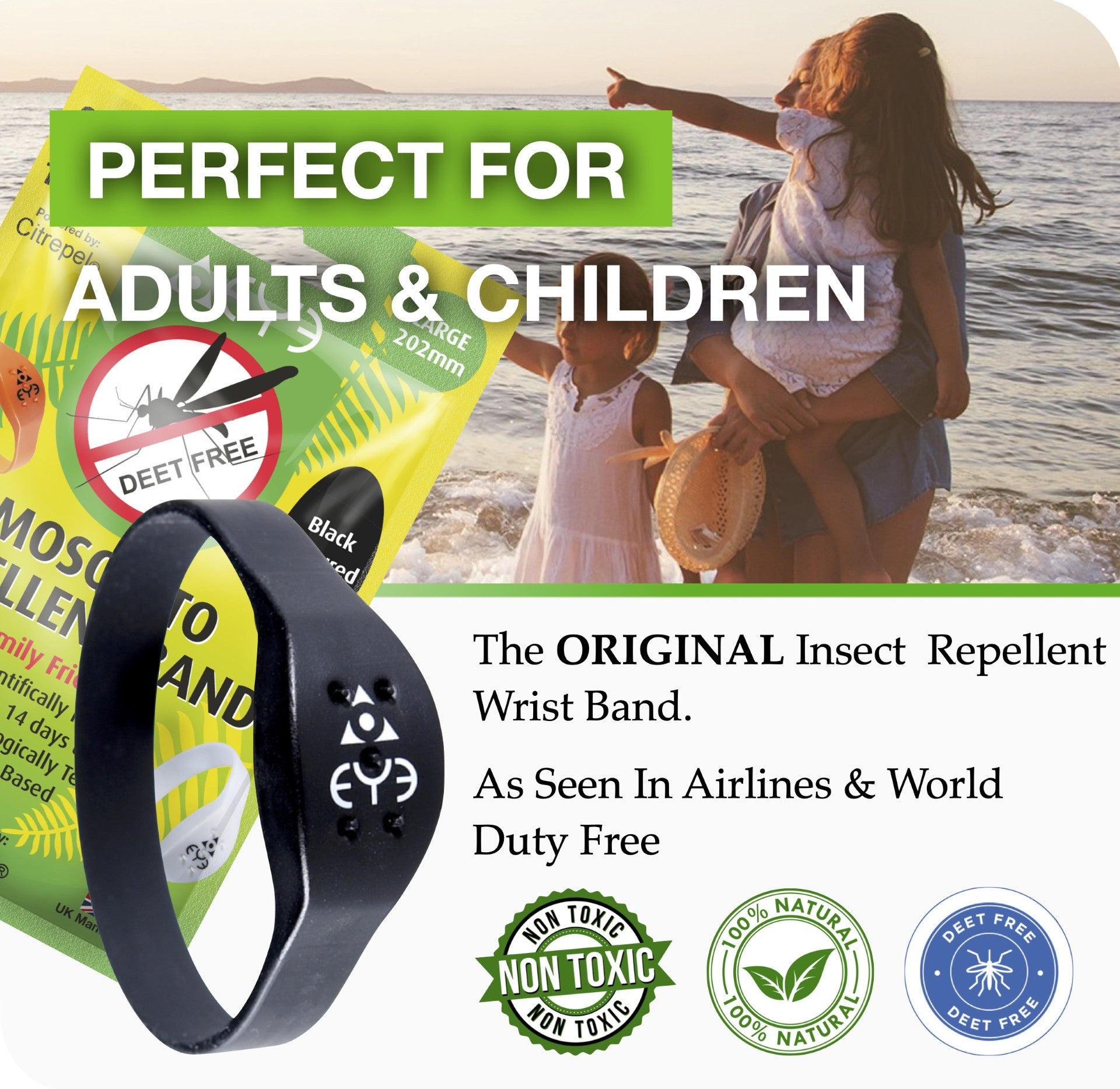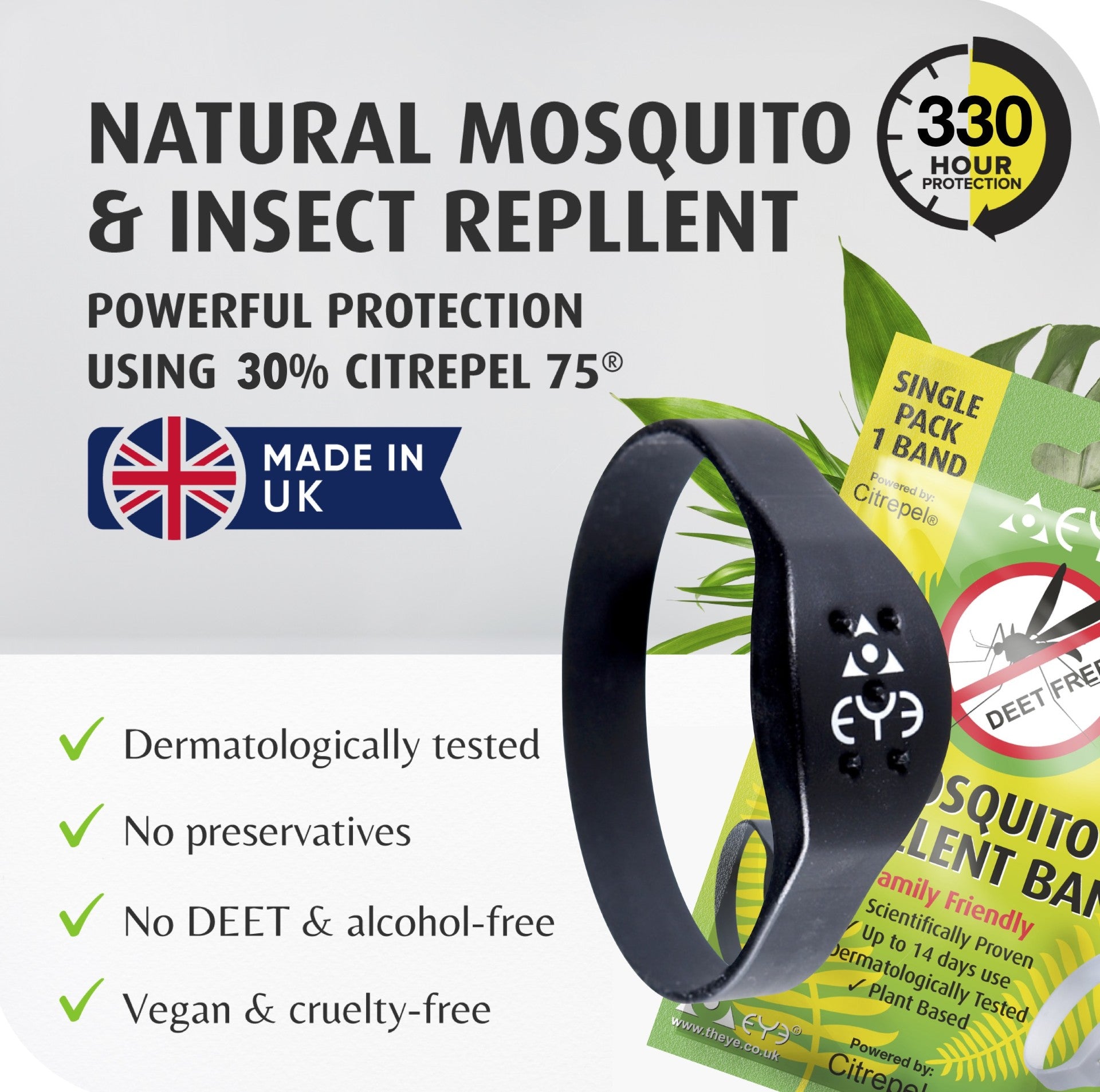 A stylish Mosquito Repellent Wrist Band Bracelet is manufactured from silicone and has been designed to contain a natural plant-based insect repellent which is the oil of lemon eucalyptus (Citrepel) This has been proven to repel mosquitos in clinical testing.